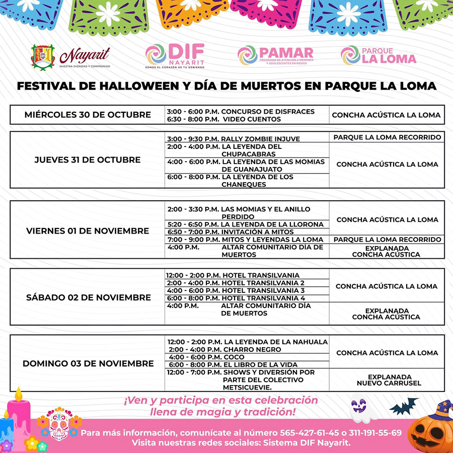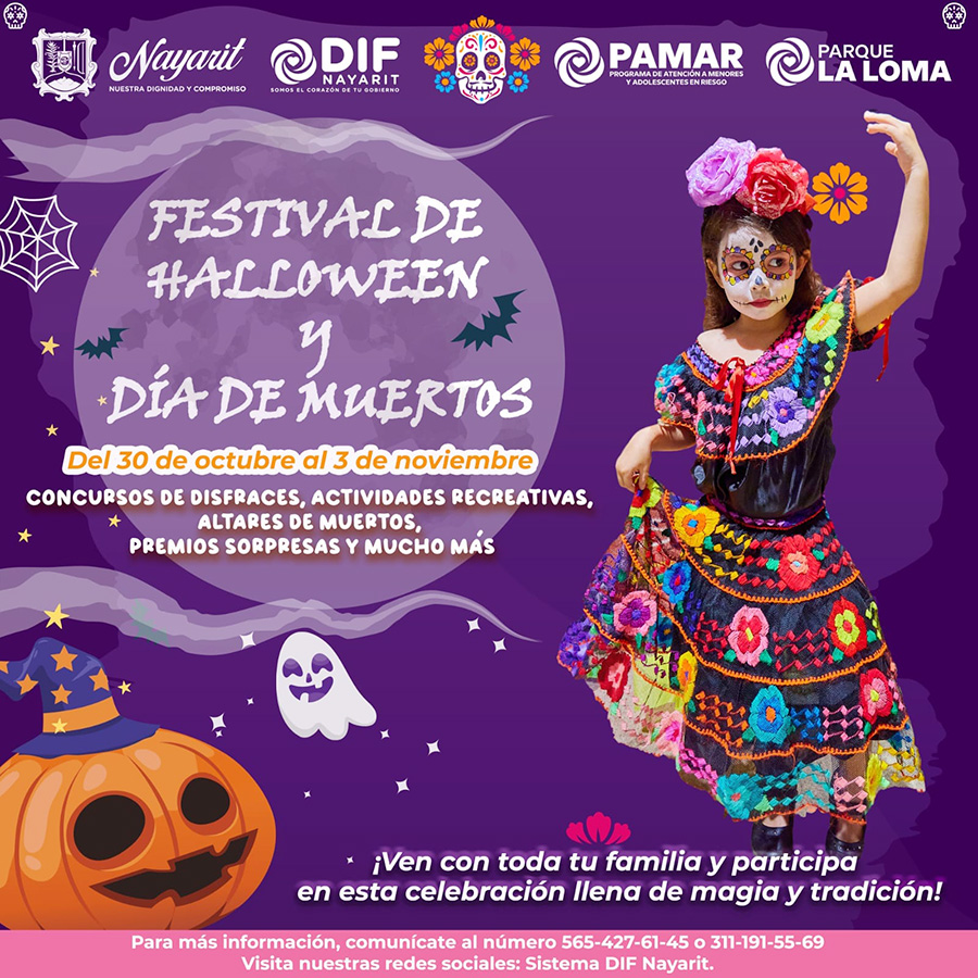 Ven y disfruta con toda tu familia de concursos de disfraces, cine al aire libre, actividades recreativas, premios sorpresa ¡y mucho más! Te esperamos del 30 de octubre al 3 de noviembre en el Parque La Loma de Tepic.
