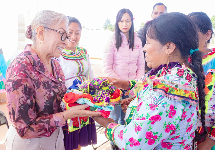 Del Nayar, Nayarit.- En un ambiente de alegría y con un fraternal recibimiento, cientos de familias del municipio Del Nayar agradecieron a la doctora Beatriz Estrada Martínez, presidenta del Sistema DIF Nayarit, por los apoyos entregados para la confección de artesanías, impulsando así la economía de los hogares de la zona.