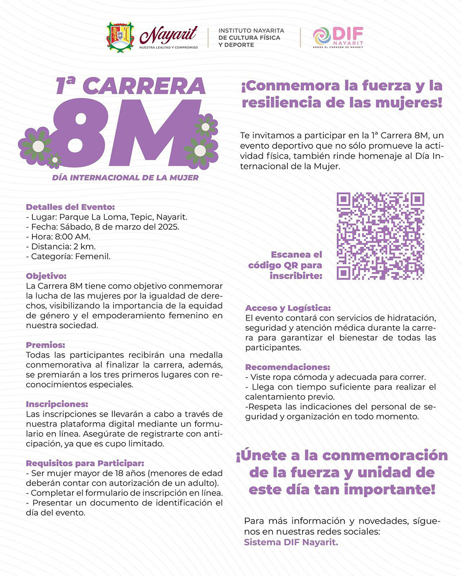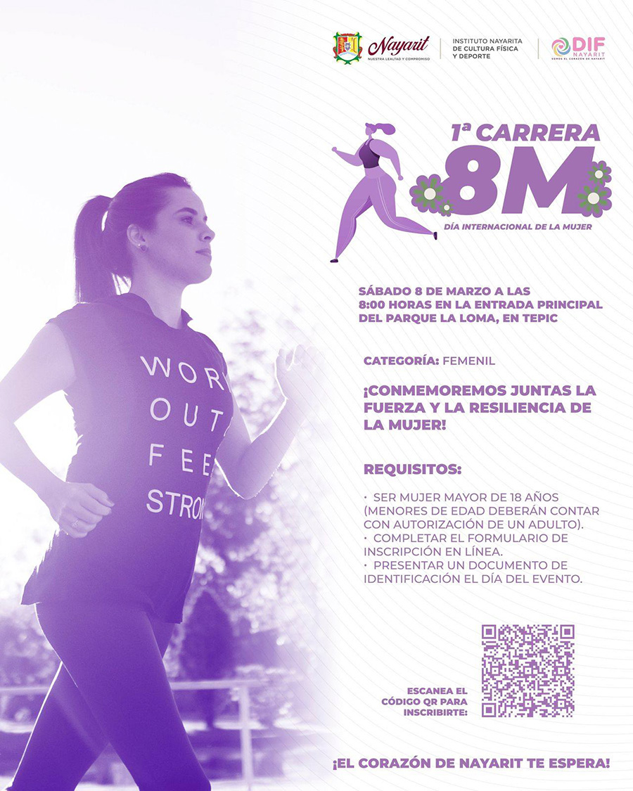 El DIF Nayarit te invita a participar en la Carrera 8M, un evento especial con motivo del Día Internacional de la Mujer. La cita es este 8 de marzo en el Parque La Loma de Tepic.