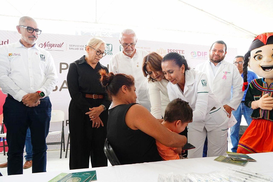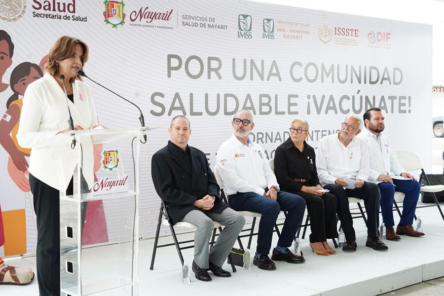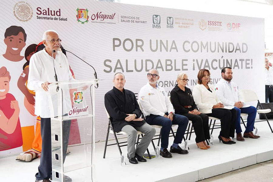 Tepic, Nayarit.- Este lunes, con la presencia del gobernador del estado, Miguel Ángel Navarro Quintero y de su esposa, la presidenta del Sistema DIF Nayarit, doctora Beatriz Estrada Martínez, los Servicios de Salud de Nayarit arrancaron la Jornada Intensiva de Vacunación Intersectorial, bajo el lema: Por una comunidad saludable, vacúnate, que tiene como propósito la reducción de la morbilidad y mortalidad por enfermedades prevenibles con la vacunación, así como alcanzar y mantener coberturas de vacunación del 95 por ciento por biológico y 90 por ciento de cobertura con esquema completo en cada grupo de edad.