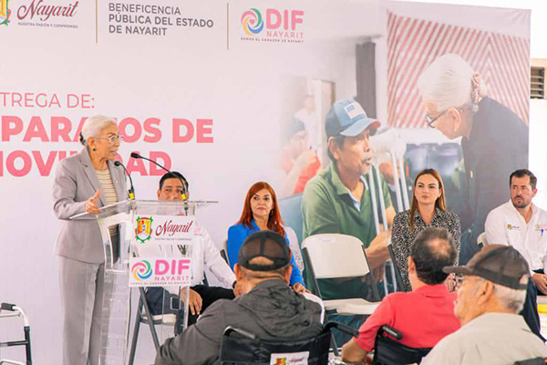 Tepic, Nayarit.- Con la convicción de fortalecer la autonomía y la independencia de quienes enfrentan barreras físicas, la presidenta del Sistema DIF Nayarit, doctora Beatriz Estrada Martínez, encabezó la entrega de 106 aparatos de movilidad asistida en beneficio de familias de 11 municipios de la entidad.
