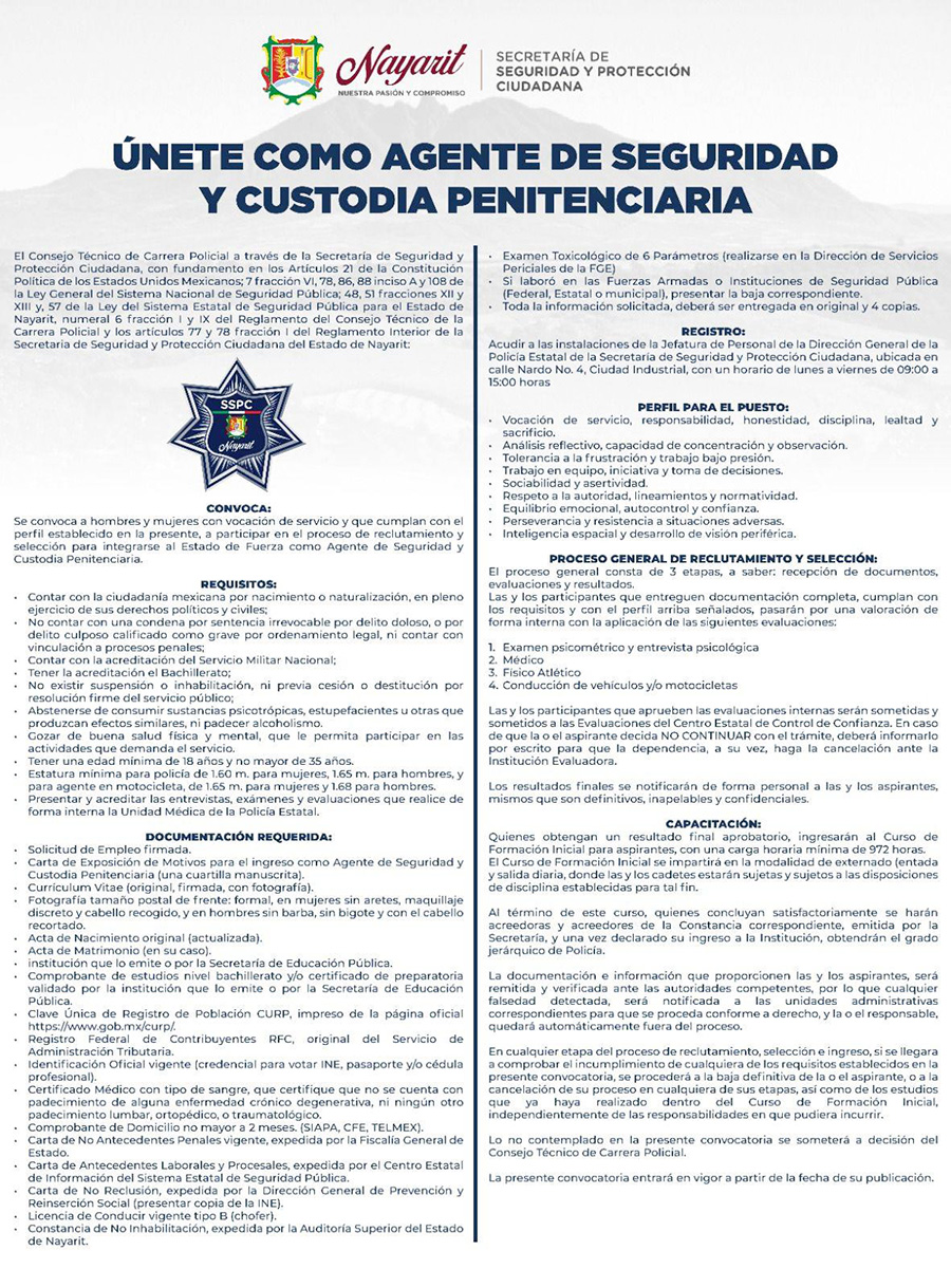 El Gobierno del Estado de Nayarit, a través de la Secretaría de Seguridad y Protección Ciudadana, te invita a formar parte del proceso de reclutamiento para ser Agente de Seguridad y Custodia Penitenciaria.