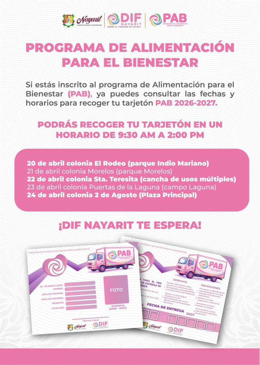 El Sistema DIF Nayarit, encabezado por la doctora Beatriz Estrada Martínez, inicia la entrega de tarjetones del Programa de Alimentación para el Bienestar (PAB) 2026-2027.