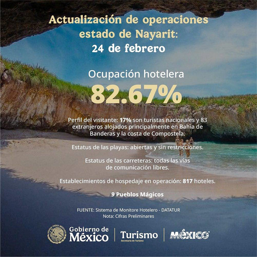 El estado de Nayarit continúa consolidándose entre los destinos turísticos más visitados de México, informó la Secretaría de Turismo del Gobierno Federal, al registrar una ocupación hotelera del 82.67 %, con corte al 24 de febrero.